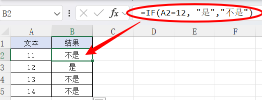 2.选择一个需要判断的单元格A2,等于输入12,相等得到 是,否则得到 不是,公式存放到单元格B2,然后点击确定按钮
