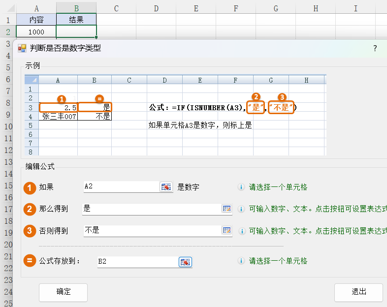 2.选择一个需要判断的单元格A2,如果A2是数字那么得到 是,否则得到 不是,公式存放到单元格B2,然后点击确定按钮