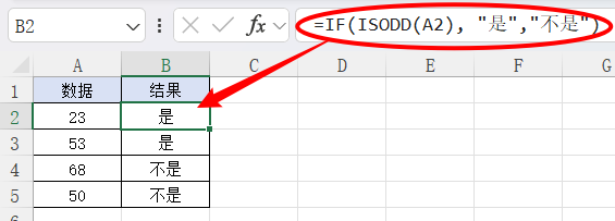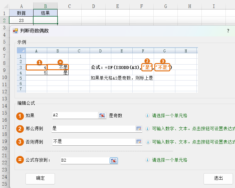2.选择一个需要判断的单元格A2,如果A2是奇数那么得到 是,否则得到 不是,公式存放到单元格B2,然后点击确定按钮
