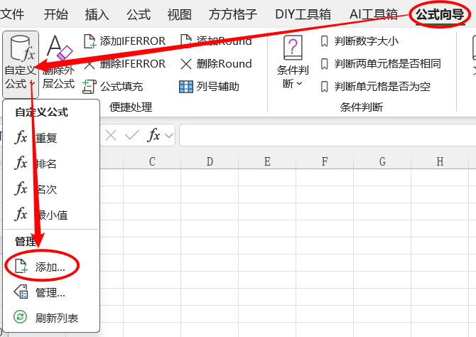 工作中,经常遇到有些公式嵌套多层,或者公式很长,但又很常用,每次都写一遍很麻烦。方方格子的自定义公式功能,可以添加常用公式,需要时直接导入使用。