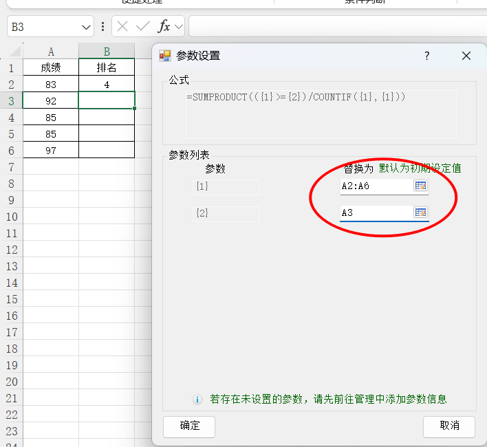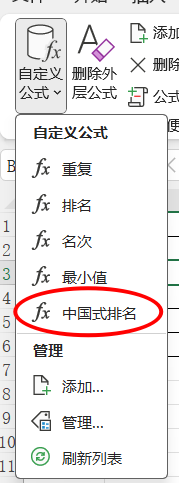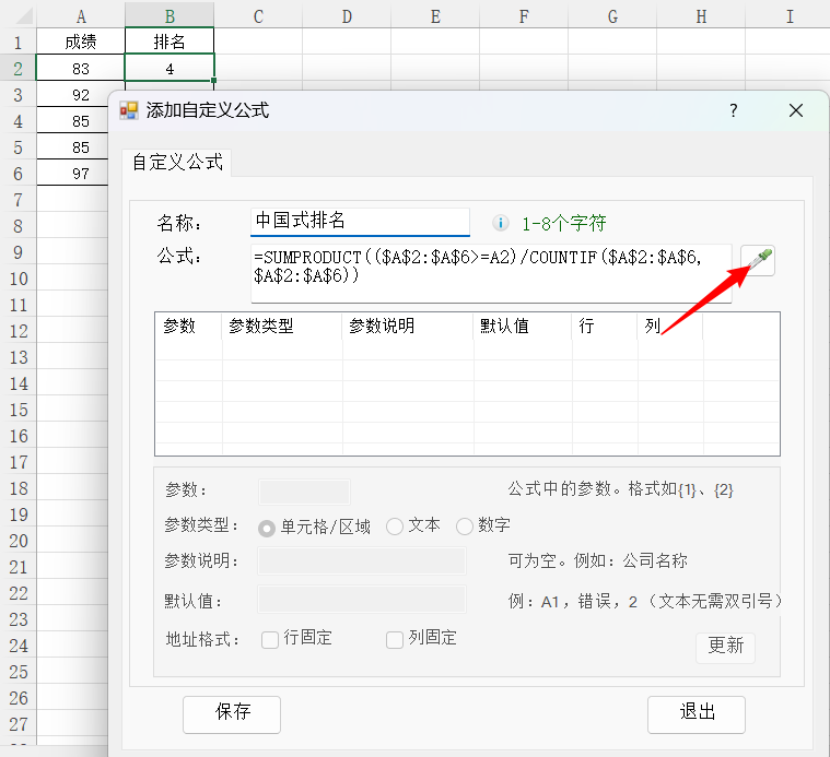 4.添加完自定义公式后,就可以在其他地方使用这个公式,选择单元格B3,点击添加的自定义公式,进行参数设置,修改参数{2}的设定值为A3,即可求取A3单元格的中国式排名