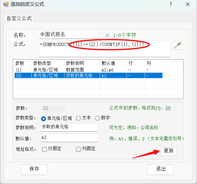 3. 将可变的参数改成指定规则保存,数据所在范围设置为参数{1},添加参数说明:数据区域,默认值设为A2:A6,然后点击更新按钮;将要求取的单元格设置为参数{2},添加参数说明:求取的单元格,默认值设为A2,然后点击更新按钮;设置完成后点击保存按钮