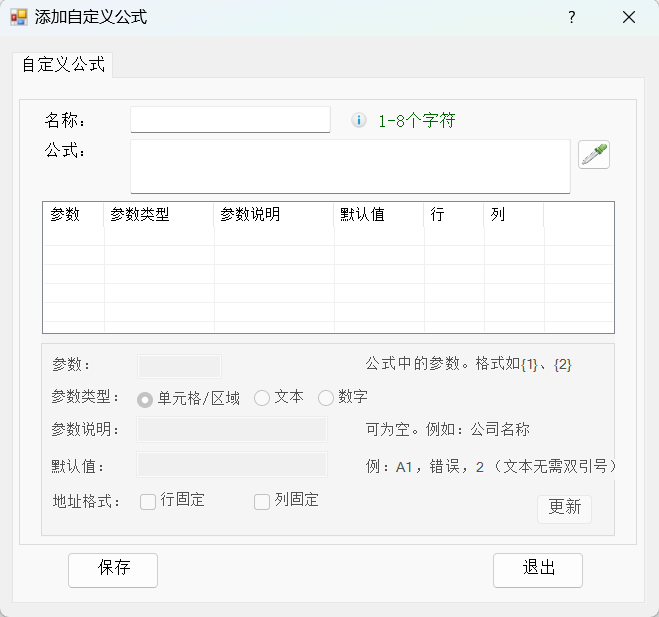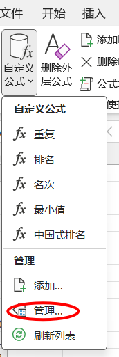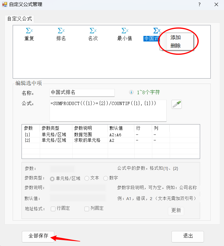 可在自定义公式选项下点击管理选项进入公式管理,鼠标右键自定义公式可进行添加和删除公式,可在管理界面编辑修改公式。操作完成后需要点击全部保存按钮进行保存。