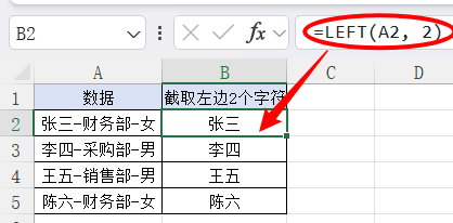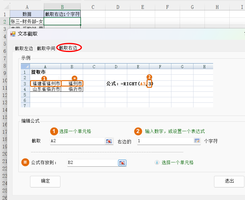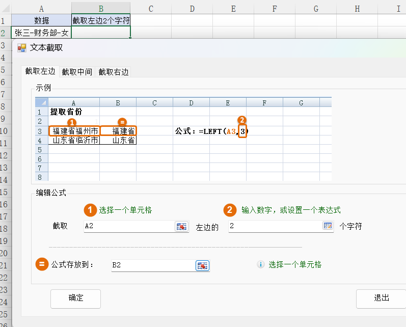2.选择需要截取文本的单元格A2左边的2个字符,公式存放到B2,然后点击确定按钮