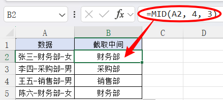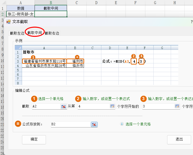 1.选择功能的第二个选项卡-截取中间,选择需要截取文本的单元格A2,从第4个字符开始的3个字符,然后点击确定按钮
