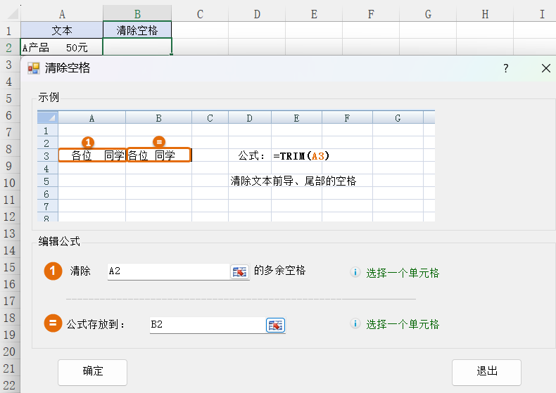 2.选择需要清楚空格的单元格A2,公式存放到B2,然后点击确定按钮