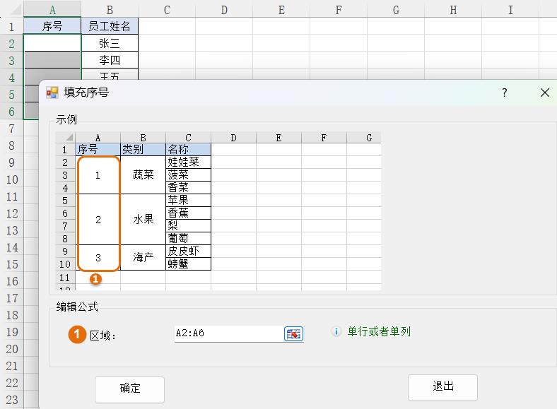 2.选择需要填充序号的区域A2:A6,然后点击确定按钮