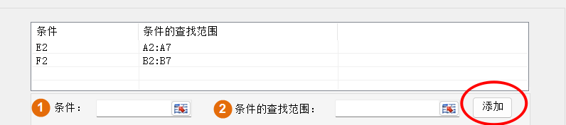 2.选择条件1:E2单元格,条件1的查找范围A2:A7,点击添加按钮;选择条件2:F2单元格,条件2的查找范围B2:B7,点击添加按钮;添加成功的条件会显示在条件列表;数据范围选择C2:C7,结果存放G2,然后点击确定按钮