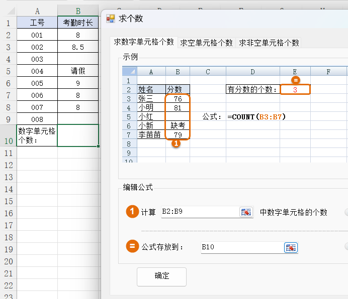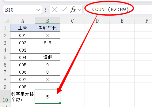 2.计算B2:B9中数字单元格的个数,公式存放到B10,然后点击确定按钮