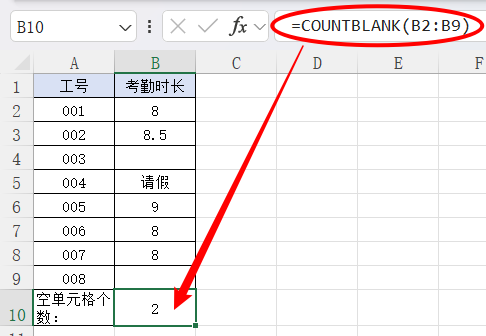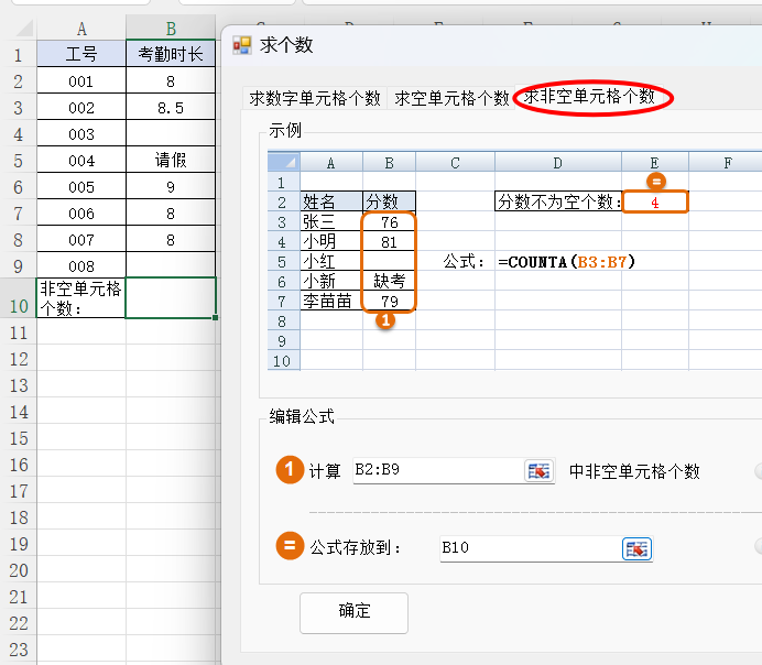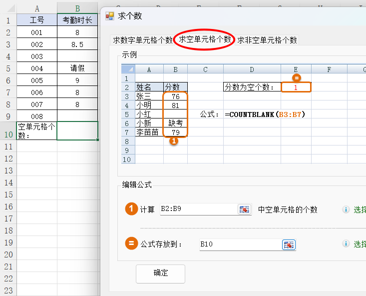 1. 选择功能的第二个选项卡 求空单元格个数,计算B2:B9中空单元格的个数,公式存放到B10,然后点击确定按钮