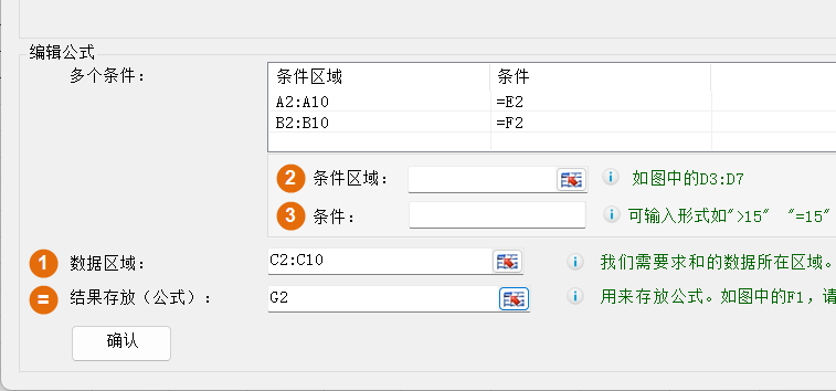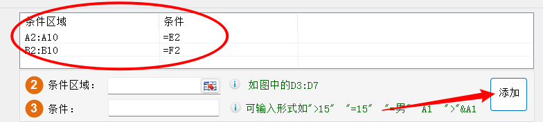 2.选择条件1区域:A2:A10,条件1:E2,然后点击右侧的添加按钮;选择条件2区域:B2:B10,条件2:F2,然后点击右侧的添加按钮,将多个条件添加到列表
