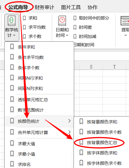 1.点击公式向导> 数学统计 >按颜色统计>按背景颜色汇总