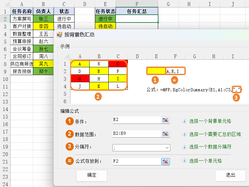 2.条件选择带有背景色的单元格E2,数据范围选择B2:B9,分隔符选择:”;”,公式存放到F2,然后点击确定按钮