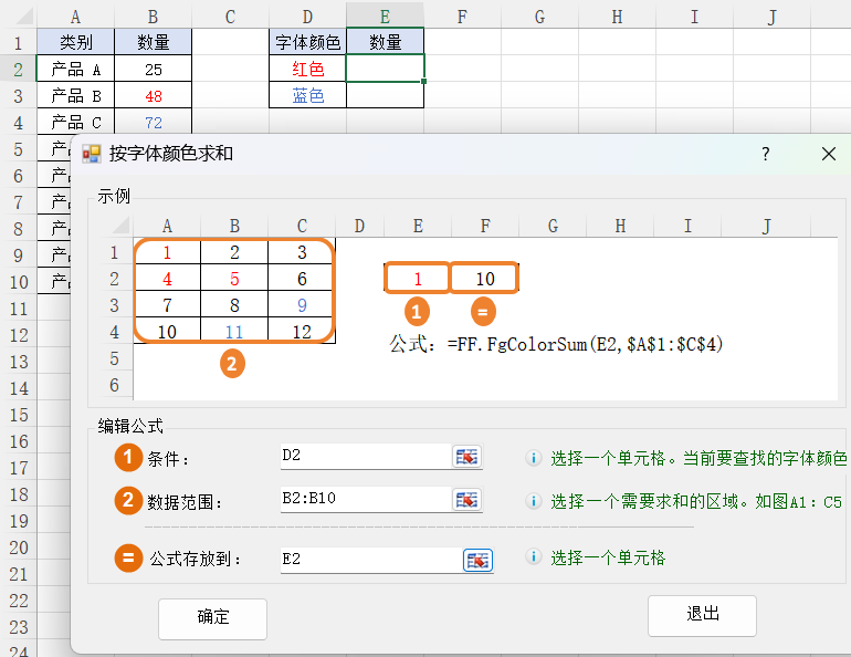 2.条件选择带有字体颜色的单元格D2,数据范围选择B2:B10,公式存放到E2,然后点击确定按钮