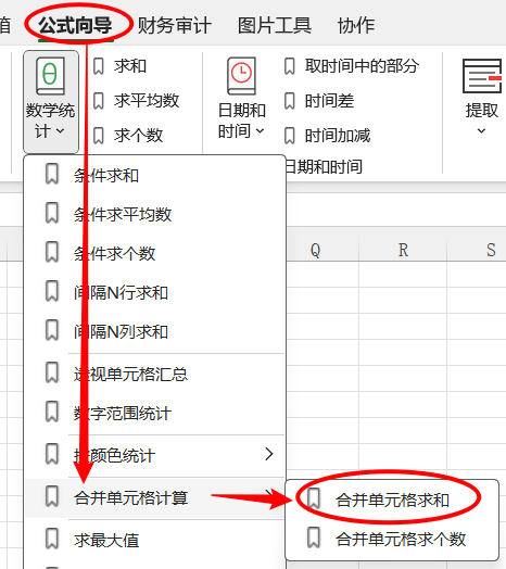 1.点击公式向导> 数学统计 >合并单元格计算>合并单元格求和