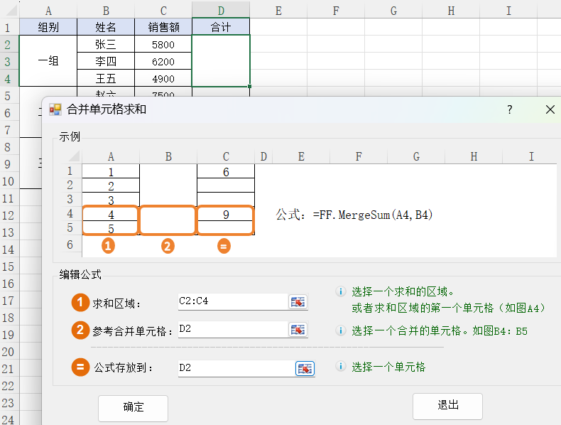 2.选择求和区域C2:C4,参考合并单元格D2,公式存放到D2,然后点击确定按钮