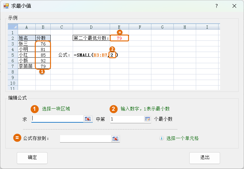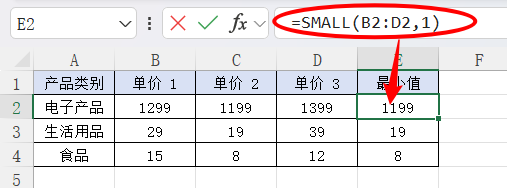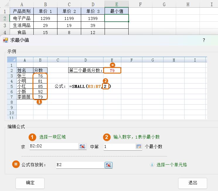 2.选择区域B2:D2中第1个最小数,公式存放到E2,然后点击确定按钮
