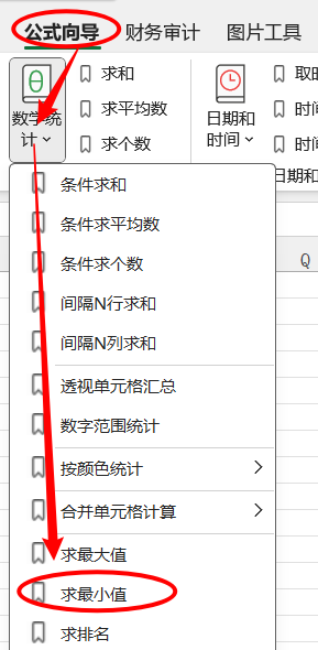 1.点击公式向导> 数学统计 >求最小值