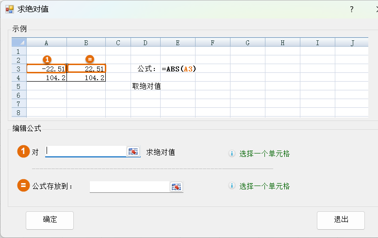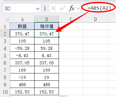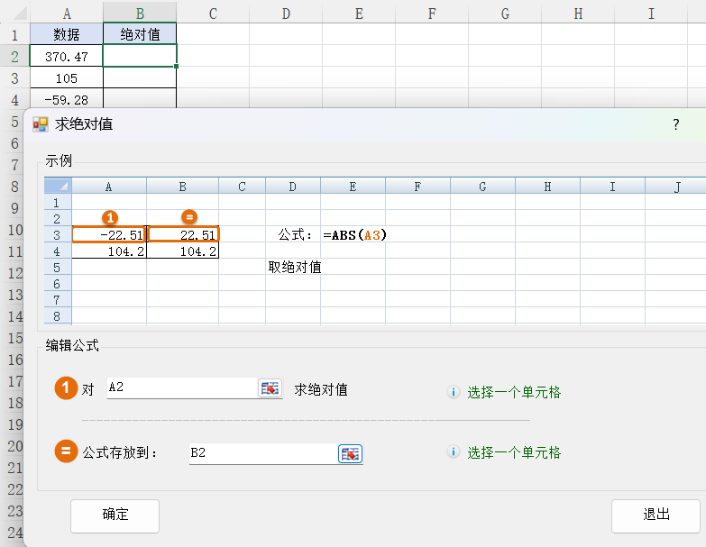 2.对A2求绝对值,公式存放到B2,然后点击确定按钮