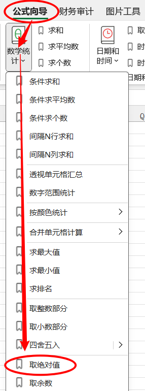 1.点击公式向导> 数学统计 >取绝对值