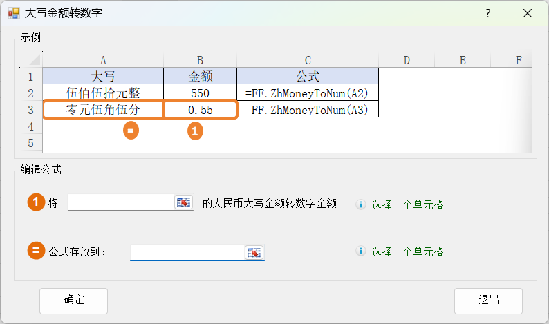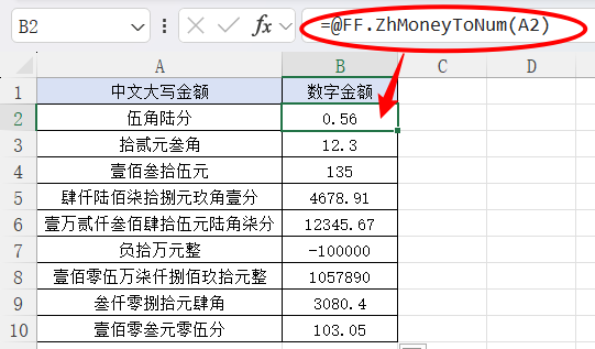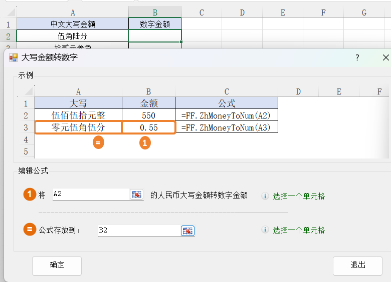 2.将A2的人民币大写金转数字金额,公式存放到B2,然后点击确定按钮