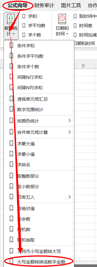 1.点击公式向导> 数学统计 >大写金额转换成数字金额