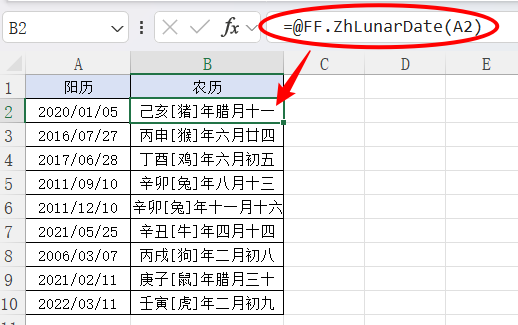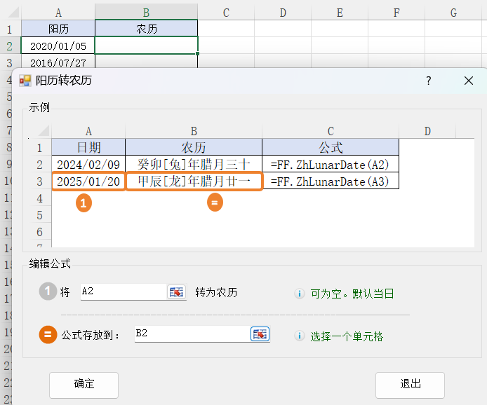 2.将A2单元格转为农历,公式存放到B2,然后点击确定按钮