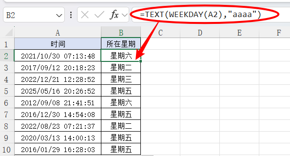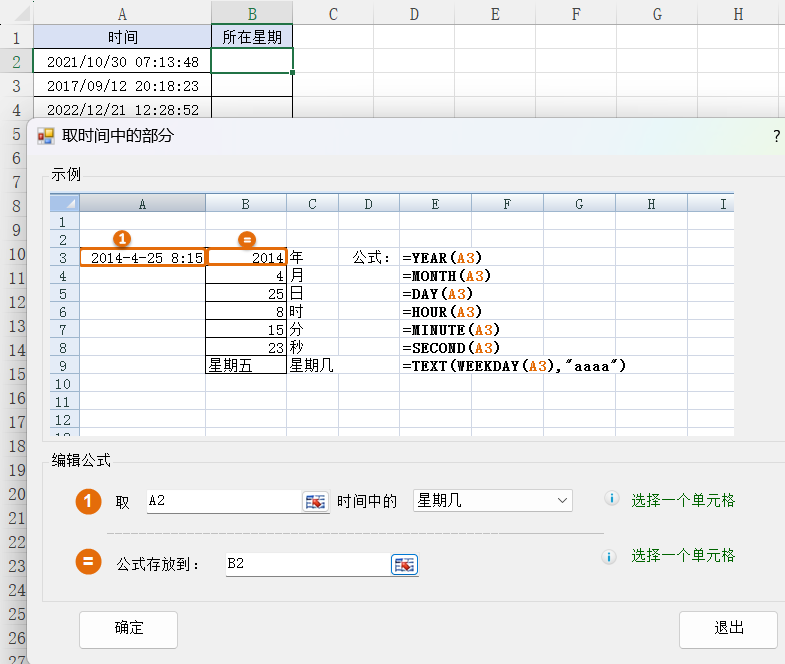 2.取A2时间中的星期几,公式存放到B2,然后点击确定按钮