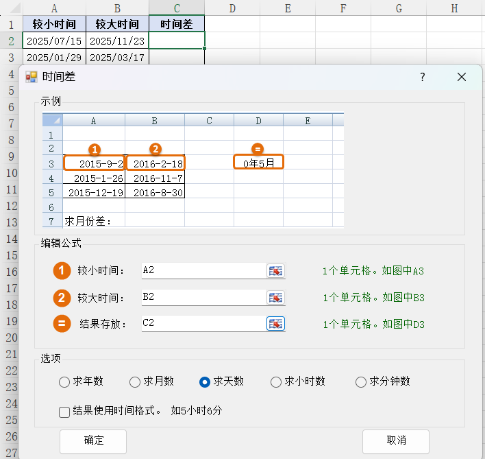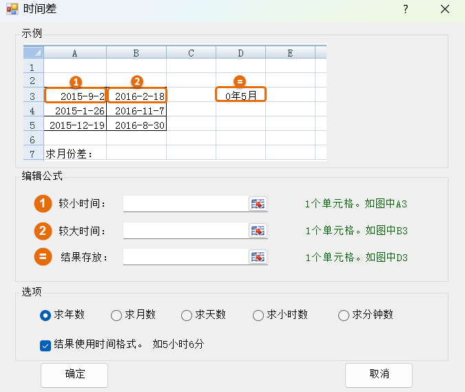 提示;支持求年数、月数、天数、小时数和分钟数;