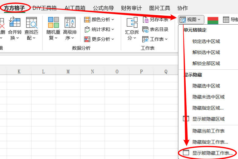 1. 点击方方格子> 视图 >显示被隐藏工作表