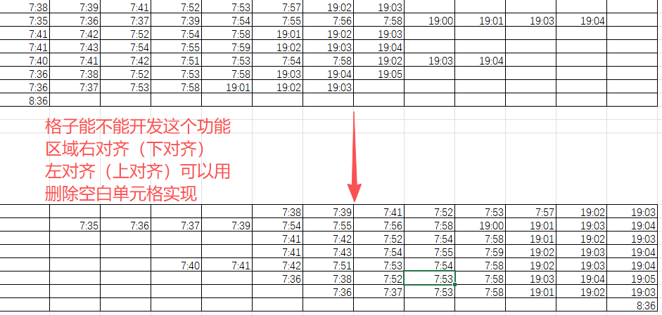 上次我提的区域右对齐功能其实格子也有,需要两步,先左右转置,然后左对齐(删除空单元格左移单元格),再左右转置即可,方方格子只是没有那么直接而已,不过右对齐和下对齐我这段时间老用到。