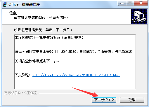 双击运行文件夹中的“Office一键安装程序”。界面如下图,此时请确认关闭了所有的安全杀毒软件,然后点击下一步。
