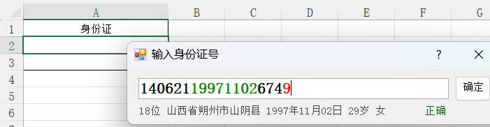 2.点击单元格A2,在功能界面输入身份证号码,下方可实时显示身份证信息,然后点击确定按钮