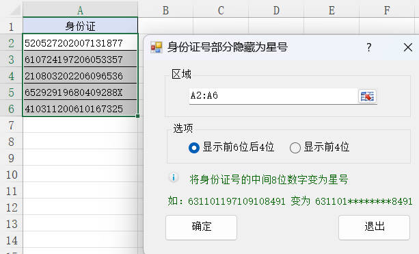 2.选择区域A2:A6,显示前6位后4位,然后点击确定按钮
