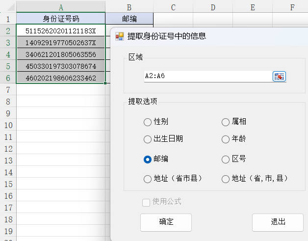 2.选择区域A2:A6,提取选项选择邮编,然后点击确定按钮