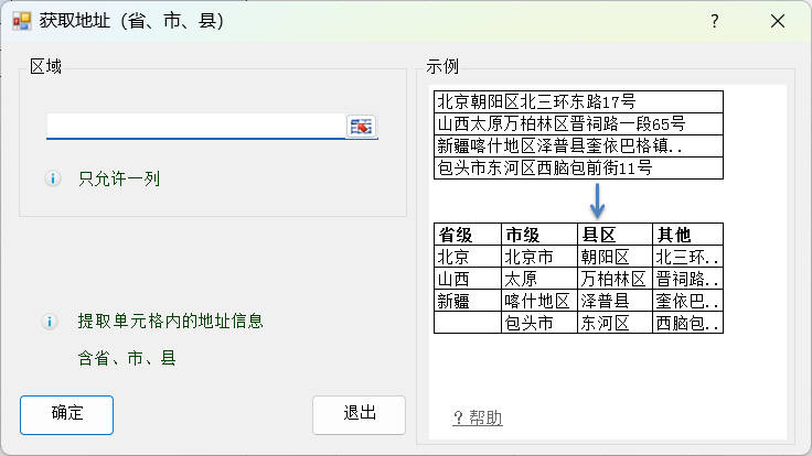 提取地址功能,可将地址拆分提取出省级、市级、县区级信息,剩余详细地址归入 “其他” 列,适用于地址整理、数据分类归档等场景,大幅提升地址结构化处理效率。