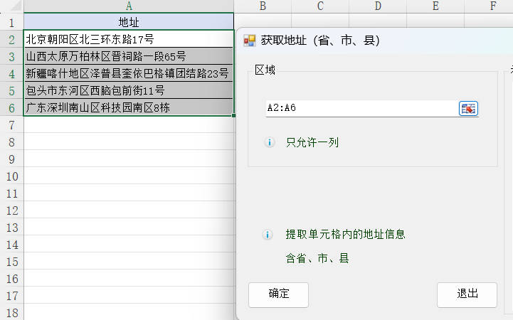 2.选择需提取的地址区域A2:A6,然后点击确定按钮