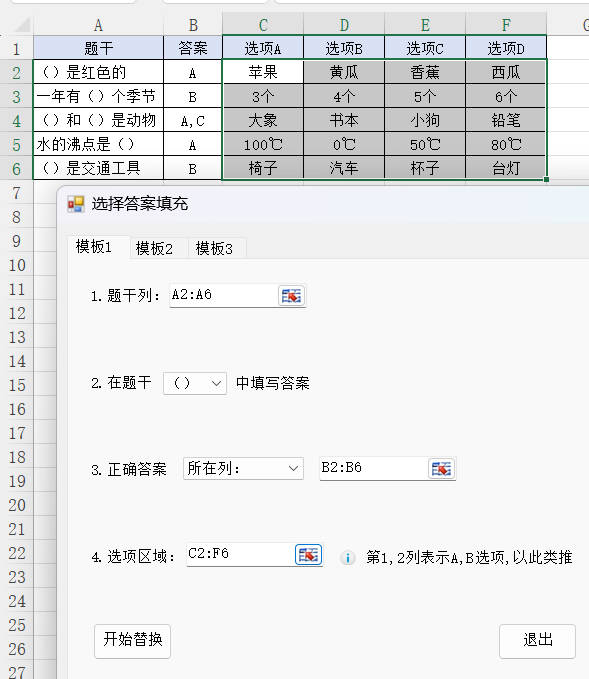 如果所有答案选项都在一个单元格内,如:A.xxx,Bxxx,Cxxx,可以选择功能的第三个选项卡-模版3来进行填充