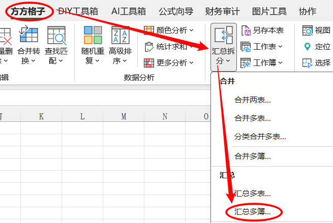 1.点击 方方格子>工作表> 汇总拆分> 汇总多簿...