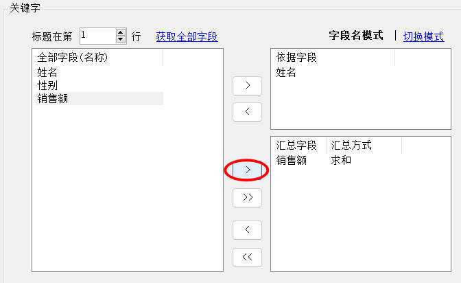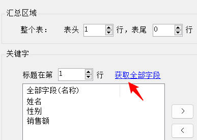 3.汇总区域设置表头1行,关键字设置标题在第1行,然后点击获取全部字段;分别选择需要依据和汇总的字段,添加到右侧列表(在左侧选中字段,点击中间的添加按钮即可添加到右侧),设置完成后点击下一步按钮