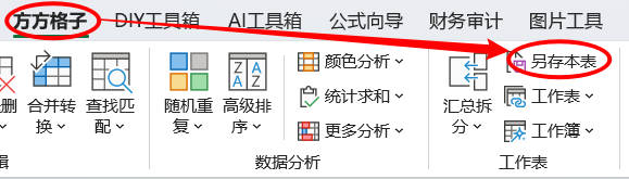 1.点击 方方格子>工作表> 另存本表