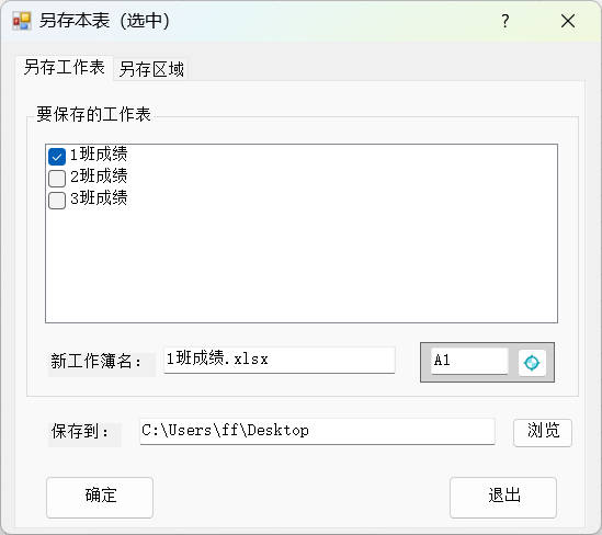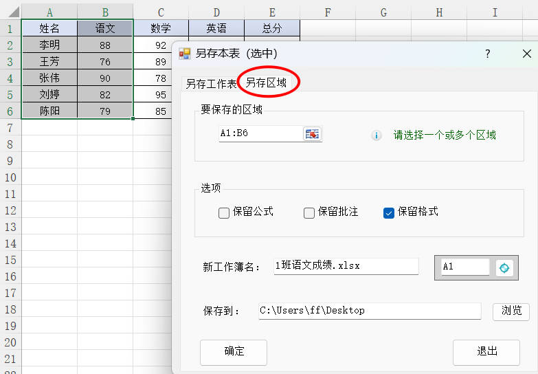 1.选择功能的第二个选项卡 另存区域,设置要保存的区域A1:B6,勾选保留格式,新工作簿命名为:1班语文成绩,保存到桌面,然后点击确定按钮
