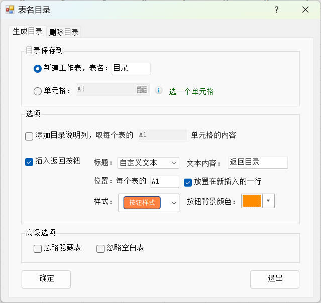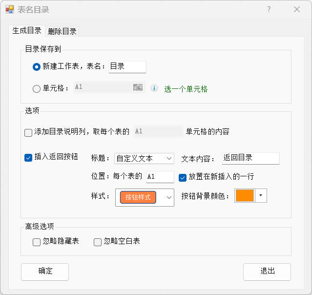 2.设置目录保存到新建工作表,表名为:目录;勾选插入返回按钮,按钮标题为自定义文本,内容:返回目录,按钮位置位于每个表的AI单元格,且新增一行插入按钮,样式选择按钮样式,背景色橙色。然后点击确定按钮