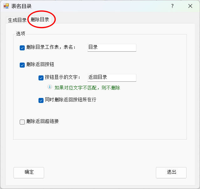 1.选择功能的第二个选项卡 删除目录,勾选删除目录工作表,表名为:目录,勾选删除返回按钮,按钮显示文字:返回按钮,同时删除返回按钮所在行。然后点击确定按钮