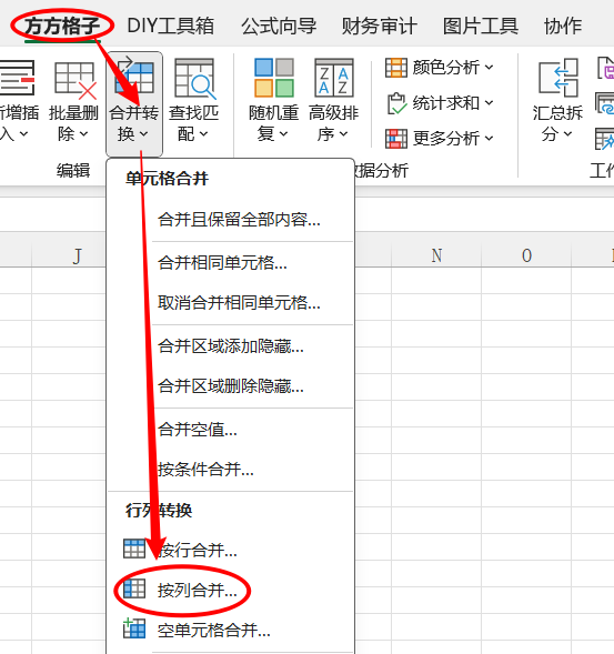 1.点击方方格子>编辑>合并转换>按列合并…