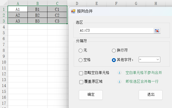 2.选择区域A1:C3,分隔符选择其他字符“-”,然后点击 确定 按钮