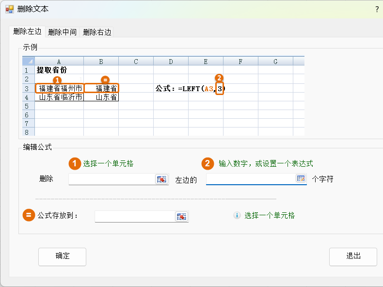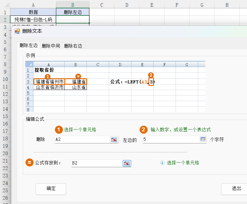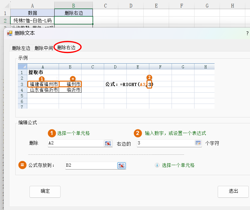 1.选择功能的第三个选项卡-删除右边,选择需要删除文本的单元格A2右边的3个字符,公式存放到B2,然后点击确定按钮
