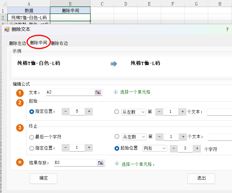 1.选择功能的第二个选项卡-删除中间,选择需要删除文本的单元格A2,起始从指定位置:5,终止到起始位置向右3个字符,结果存放到B2,然后点击确定按钮
