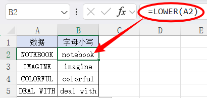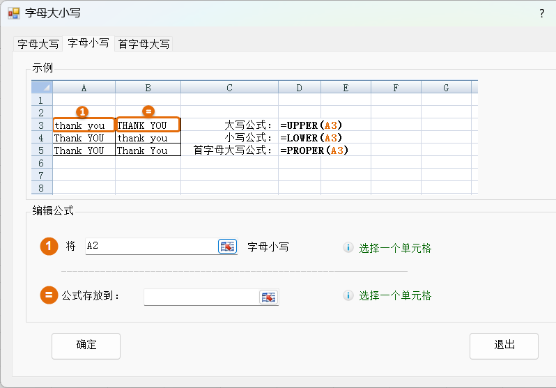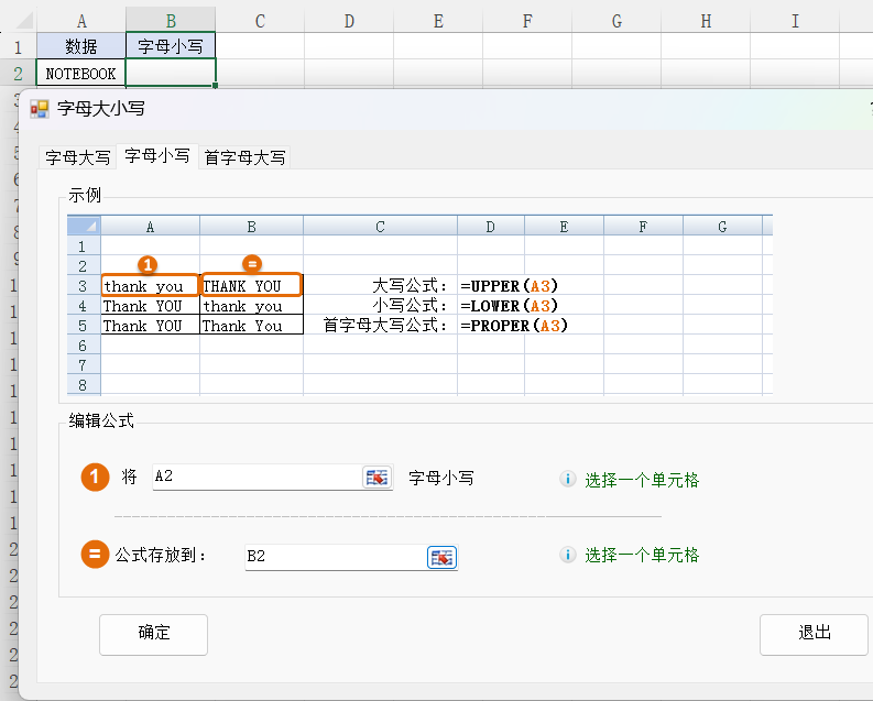 2.将A2单元格的字母小写,公式存放到B2,然后点击确定按钮