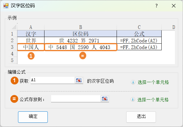 2.选择获取A2单元格的汉字区位码,公式存放到B2,然后点击确定按钮